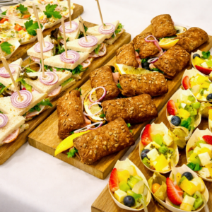 | Kohvipaus № 5 | Tee, kohv, koor, suhkur, sidrun, vesi, võileib lõhe ja toorjuustuga või võileib singi ja kurgiga | 7 € |